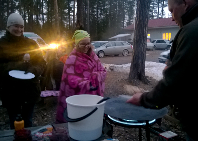 ![]() Tärkeitä MEJÄ-toimihenkilöitä: saunamajuri ja letunpaistaja Acke Holmberg sekä emännät Marjo Koskinen, Tina Wegelius ja Laura Koskinen |